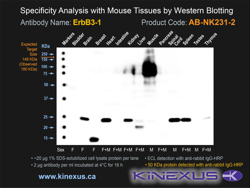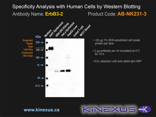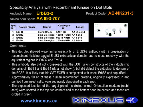 Scientific Background: ErbB3 (HER3) is a protein-tyrosine kinase of the TK group and EGFR family. It is a receptor kinase that bind and be activated by NTAK and neuregulins. It has been proposed to be deficient in phosphotransferase activity. While the kinase domain appararently lacks activity but heterodimerizes with other EGFRs permits transduction of growth signals. Phosphorylation of Y1222 and Y1260 induces interaction with PIK3C and PIK3R1. ErbB3 appears to be up-regulated in many cancer, including medulloblastomas, verrucous carcinomas, childhood medulloblastomas, carotid body tumours (CBT), and gestational trophoblastic tumours (GTD).