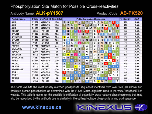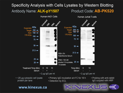 Antibody Immunogen Description: Corresponds to amino acid residues N1093 to A1099; In the region between the Transmembrane and kinase catalytic domains. One of the major in vivo sites of phosphorylation in ALK.