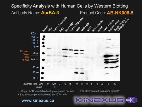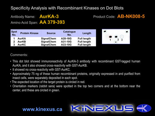 Antibody Cross Reactivity: No immunoreactivity on protein dot blots with recombinant human AurKA and AurKB.