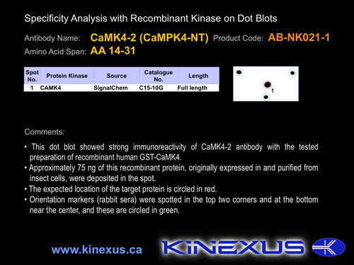Antibody Potency: Strong immunoreactivity on Western blots with recombinant mouse calmodulin-dependent protein kinase-4 expressed in sf9 insect cells.