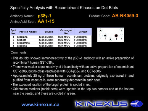 Antibody Potency: Medium-strong immunoreactivity with recombinant human p38g on protein dot blots.