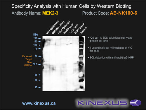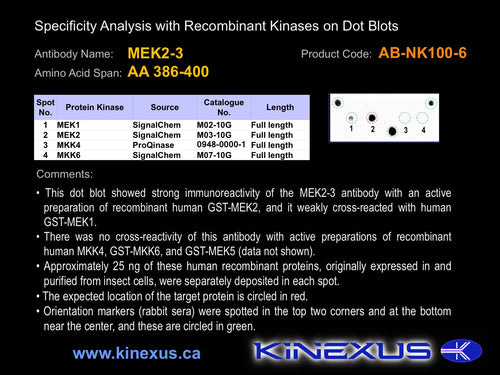Antibody Cross Reactivity: No immunoreactivity on protein dot blots with recombinant human MEK1, MKK4 and MKK6.