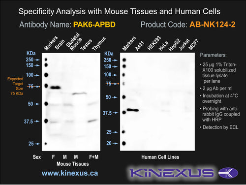 Antibody Cross Reactivity: No significant cross-reactive proteins detected in mouse brain, skeletal muscle, testes and thymus. No significant cross-reactivities detected in various human cancer cell lines, including A431, HEK-293, HeLa, HepG2, Jurkat and MCF7 cells, except for a medium 100 kDa protein.
