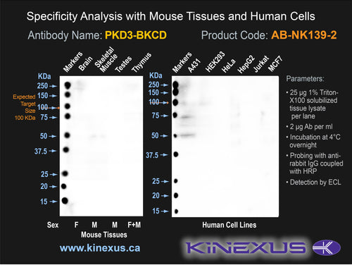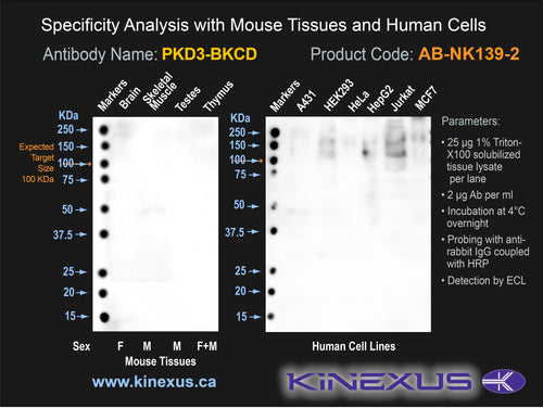 Antibody Cross Reactivity: No significant cross-reactivities detected in various human cancer cell lines, including A431, HEK-293, HeLa, HepG2, Jurkat and MCF7 cells or in mouse brain, skeletal muscle, testes and thymus.