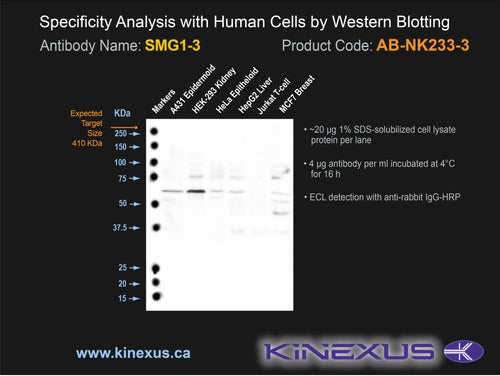 Scientific Background: SMG1 (ATX) is a protein-serine/threonine kinase of the Atypical group and PIKK family. It mediates the genotoxic stress pathway as well as the mRNA surveillance pathway. SMG1 will target nonsense RNA molecules for degradation via phosphorylation of RENT1/UPF1. SMG1 is essential for optimal phosphorylation and activity of p53/TP53 following genotoxic stress. It is iInhibited by caffeine, LY294002 and wortmannin.