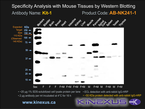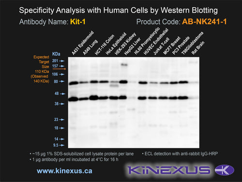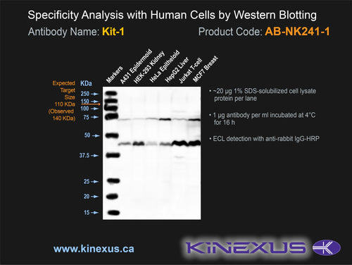 Scientific Background: Kit (SCFR) is a protein-tyrosine kinase of the TK group and PDGFR family. It is a receptor kinase that binds SCF/KitLG. Mast,stem cell growth factor (steel factor) binding induces Kit dimerization and autophosphorylation. Protein interactions are induced with phosphorylation at Y568 (with APS, Cbl, SHP2, & Src), Y900 (with Crk & PIK3C2A) and Y936 (with APS, Cbl, Grb2 & Grb7). Phosphorylation of S741 and S746 inhibits the kinase activity of Kit. Kit can mediate cell proliferation, survival, hematopoiesis, gametogenesis, stem cell maintenance, mast cell development, function, and migration, as well as melanogenesis. Some substrates that Kit can phosphorylate include PIK3R1, PLCG1, SH2B2/APS and CBL.This kinase is highly expressed and widely distributed in most tested human tissues. It was first identified as the cellular homologue of the feline sarcoma viral oncogene v-kit. Mutations in Kit are associated with gastrointestinal stromal tumors (GIST), mast cell leukemia, acute myelogenous leukemia (AML), and piebaldism. Kit has also been linked with the development of colorectal adenocarcinomas and melanoma progression. Insertional mutagenesis studies in mice also support a role for this protein kinase in mouse cancer oncogenesis.