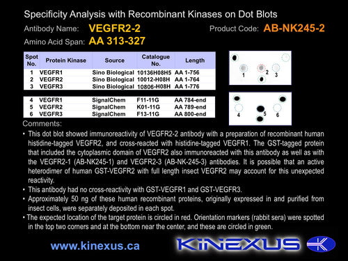 Antibody Cross Reactivity: No immunoreactivity on protein dot blots with recombinant human VEGFR1 and VEGFR3.