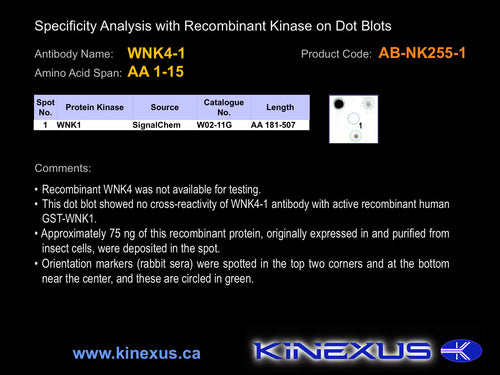 Antibody Cross Reactivity: No immunoreactivity on protein dot blots with recombinant human WNK1.