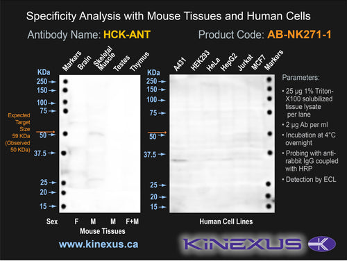 Scientific Background: Hck is a protein-tyrosine kinase of the TK group and Src family. This kinase is highly expressed and widely distributed in most tested human tissues. Hck is especially expressed in certain hemopoietic cells and especially prominent in cells of myeloid lineage, particularly mature granulocytes and monocytes. It plays important roles in the regulation of the innate immune responses including leukocyte function, phagocytosis, survival and proliferation, cell adhesion and migration. It promotes the reorganization of the actin cytoskeleton and actin polymerization, as well as the formation of podosomes. Hck is also involved in the release of inflammatory molecules from the cell, and can inhibit TP73-mediated apoptosis. Aberrant activation of Hck by the BCR-Abl protein promotes cancer cell proliferation. A D399G mutation was associated with an ovarian mucinous carcinoma sample. Hck is inhibited by phosphorylation at Y522. Hck may be an oncoprotein (OP) based on its similarity to other Src family kinases that are known oncoproteins. The active form of the protein kinase normally acts to promote tumour cell proliferation. Hck has been linked with Adenosquamous carcinoma, which is a mixed lineage carcinoma made of squamous and gland cells. Hck is activated by the HIV-1 protein Nef. Its catalytic activity can be impaired, yet affinity for target peptides increased with a Y411A mutation. The Y522F mutation will constitutively activate the kinase, leading to cellular pertubations and transformation. Phosphorylation of Y522 of Hck inhibits its phosphotransferase activity. Insertional mutagenesis studies in mice also support a role for this protein kinase in mouse cancer oncogenesis.