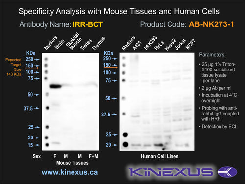 Scientific Background: IRR is a receptor protein-tyrosine kinase that is a member of the TK group of protein kinases in the InsR family. IRR is required for the appearance of male gonads and for male sexual differentiation. It can sense pH in the extracellular environment. When IRR is activated a signalling cascade is started which involves IRS1 and PKB/Akt1. A mutation that can inhibit IRR autophosphorylation is Y1145F with Y1146F. Expression of IRR mRNA is restricted to a few tissue types and has been detected in neuronal tissues as well as in neuroblastomas. As a result of its occurrence in neuroblastomas, it has speculated that IRR may be involved in tumorigenesis. RT-PCR and solution hybridization/RNAse protection assay have shown strong coupling of IRR mRNA in 18 tumour cell lines. IRR has also been linked with the development of glioblastoma multiforme and lung adenocarcinomas.