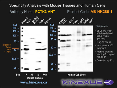 Antibody Potency: Strong immunoreactivity of a target-sized protein by Western blotting in various human cancer cell lines, including A431, HEK-293, HeLa, HepG2, Jurkat and MCF7 cells, and in mouse brain, testes and thymus.