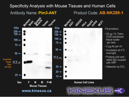 Antibody Cross Reactivity: No significant cross-reactivities detected in various human cancer cell lines, including A431, HEK-293, HeLa, HepG2, Jurkat and MCF7 cells, except for a medium ~49 kDa protein in A431 cells. No cross-reactivities detected in mouse brain, skeletal muscle, testes and thymus.