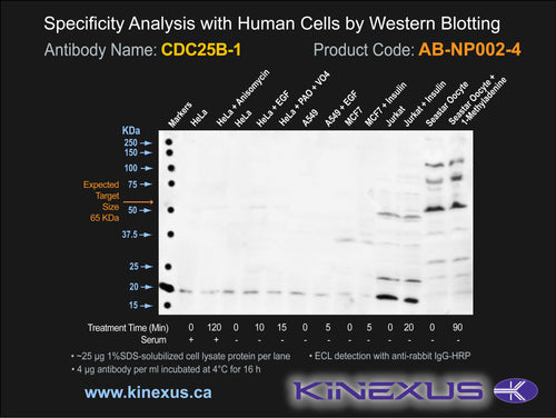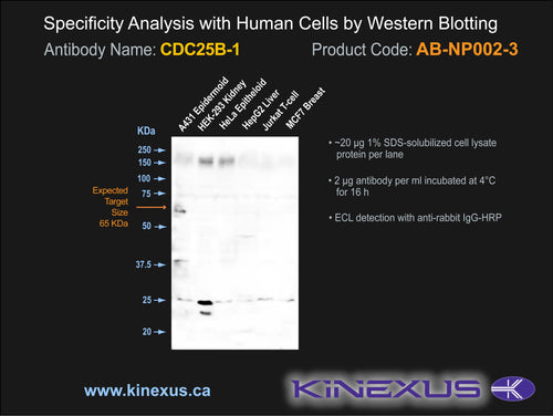 Antibody Cross Reactivity: Very weak immunoreactivity on protein dot blots with recombinant human CDC25C, but no immunoreactivity with CDC25A.