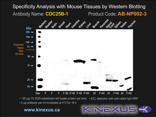Antibody Potency: Medium immunoreactivity with recombinant human CDC25B on protein dot blots.