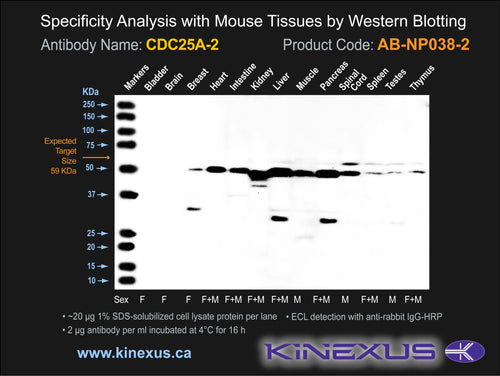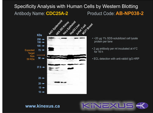 Antibody Cross Reactivity: Very weak immunoreactivity on protein dot blots with recombinant human CDC25B, but no immunoreactivity with CDC25C.