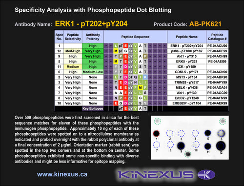 Antibody Potency: Strong immunoreactivity of a target-sized protein by Western blotting in HeLa cells treated with phenylarsine oxide and vanadate. Strong immunoreactivity with immunogen peptide on dot blots. Strong immunoreactivity with recombinant human ERK1 on protein dot blots.