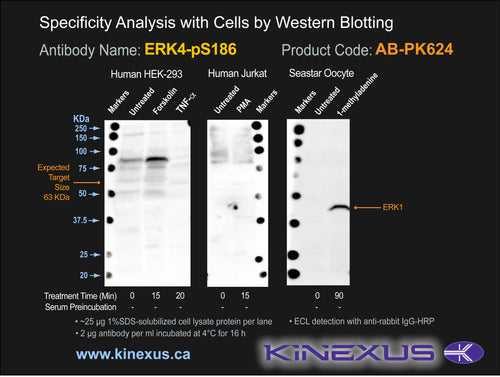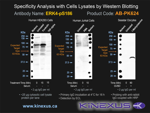 Antibody Cross Reactivity: No significant cross-reactive proteins detected in HEK-293 and Jurkat cells, and seastar oocytes, except for phospho-ERK1.