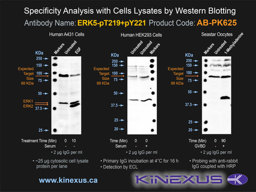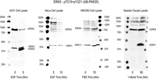 Antibody Potency: Strong immunoreactivity of a target-sized protein by Western blotting in maturing sea star oocytes and A431 cells. Weak detection of ERK5 in HEK-293, HeLa, HepG2, and MCF7. Strong immunoreactivity with immunogen peptide on dot blots.