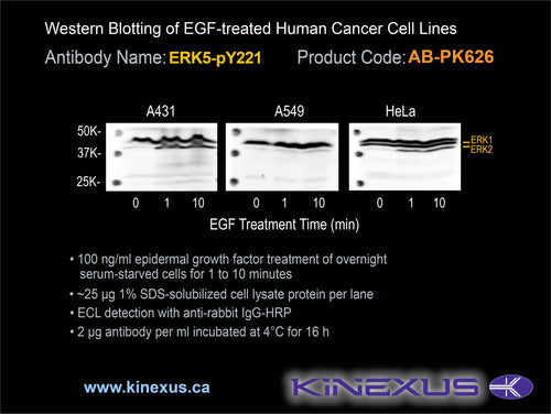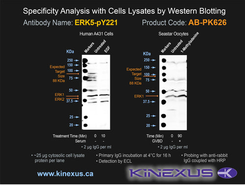 Antibody Cross Reactivity: No significant cross-reactive proteins detected in T98G cells, but manycross-reactive proteins detected in A431 cells, including phospho-ERK and phospho-p38 MAP kinases.
