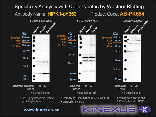 Antibody Cross Reactivity: No significant cross-reactive proteins detected in A431, HEK-293, and HeLa cells, or in sea star oocytes, except a medium cross-reactive 80 kDa protein in sea star oocytes.