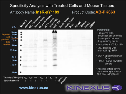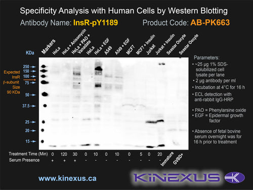 Antibody Cross Reactivity: No significant cross-reactive proteins detected in phenylarsine oxide (PAO)+vanadate-treated HeLa cells, EGF-treated A431 cells and insulin-treated MCF7 cells, when these cells were homogenized in SDS-PAGE sample buffer, except for a 26K cross-reactive protein in EGF-treated HeLa cells.