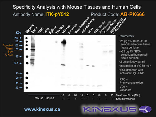 Antibody Cross Reactivity: Strongly immunoreactivity on protein dot blots with recombinant human JAK3 and TYK2, which feature similar phosphosite sequences. No significant cross-reactive proteins detected in phenylarsine oxide (PAO)+vanadate-treated HeLa cells, EGF-treated A431 cells and insulin-treated MCF7 cells, when these cells were homogenized in SDS-PAGE sample buffer. A strong background >75 kDa in insulin-treated MCF7 cells was observed.