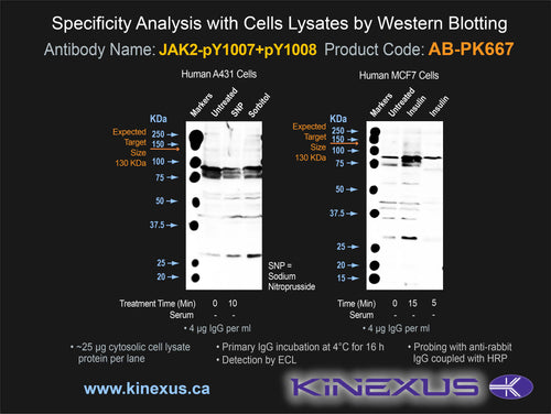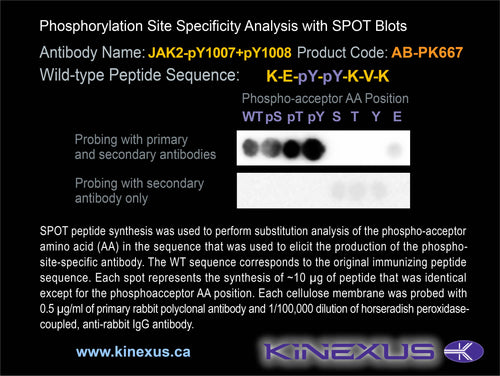 Antibody Potency: Strong immunoreactivity of a target-sized protein by Western blotting in HepG2 and HeLa cells. Very strong immunoreactivity with immunogen peptide on dot blots. Strong immunoreactivity with recombinant human JAK2 on protein dot blots.