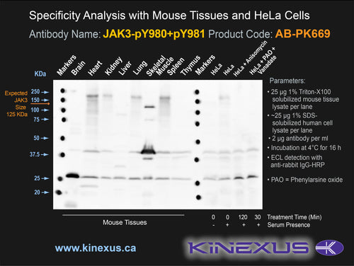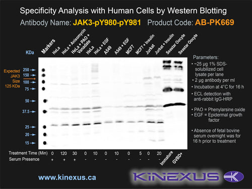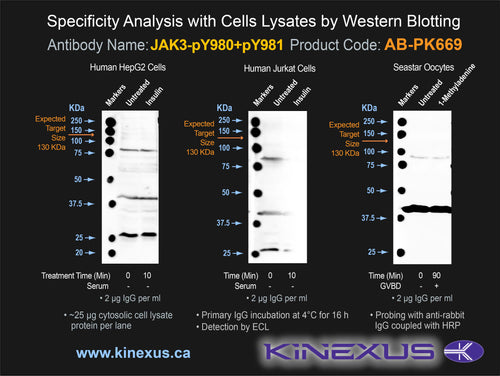 Antibody Cross Reactivity: Strong immunoreactivity on protein dot blots with recombinant human JNK2, but very weak immunoreactivity with JNK3. No significant cross-reactive proteins detected in A431, A549, HeLa and MCF7 cells and in sea star oocytes, except for a ~77 kDa cross-reactive protein in A431 and Hela cells.