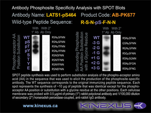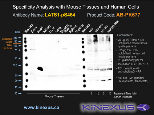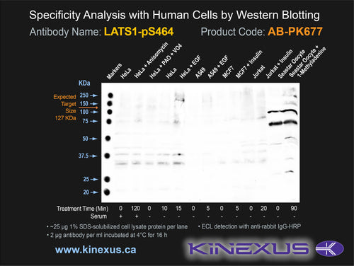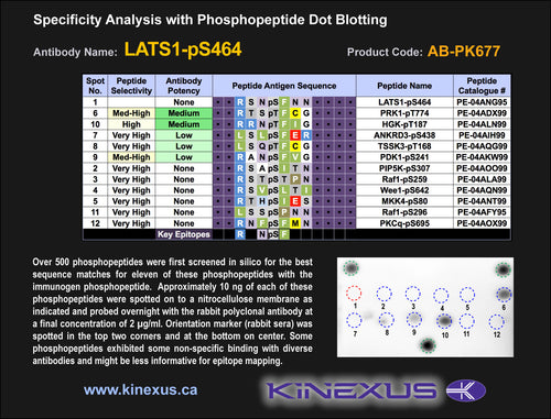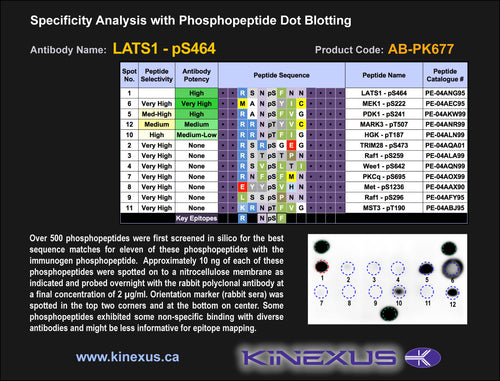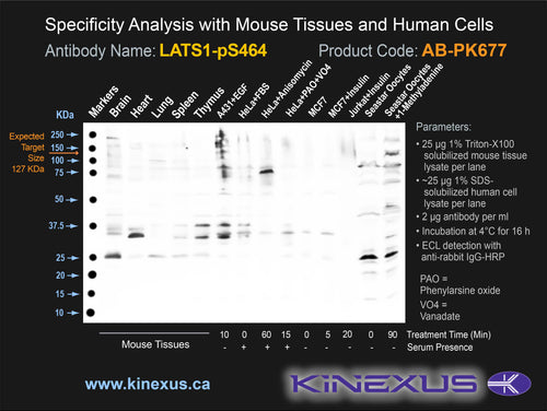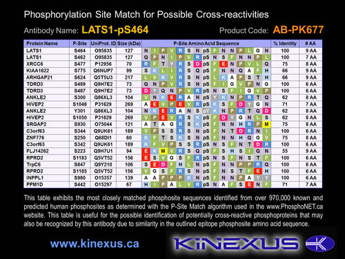 Antibody Immunogen Description: Corresponds to amino acid residues R461 to N467; In the N-terminal half of the protein. One of the two major in vivo phosphorylation sites in LATS1.