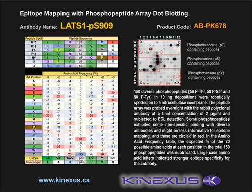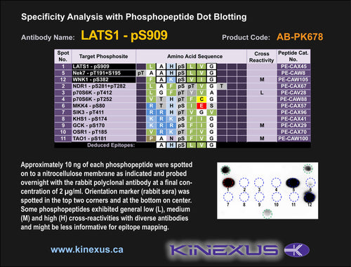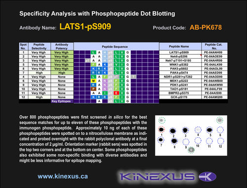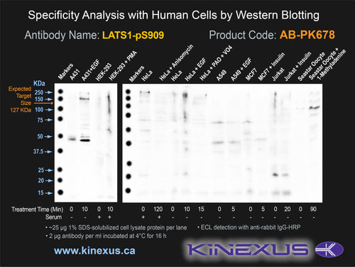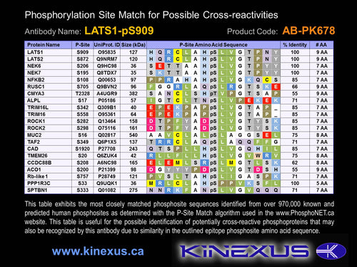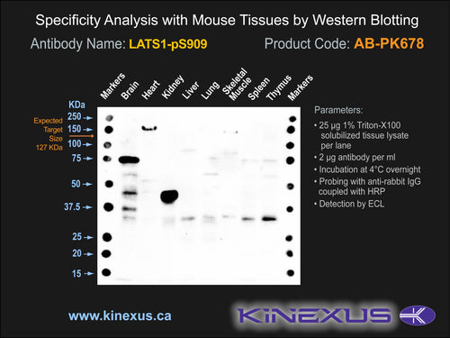 Scientific Background: LATS1 (WARTS) is a protein-serine/threonine kinase of the AGC group and NDR family. LATS1 appears to be a tumour suppressor protein (TSP), although it undergoes a typical rate of bystander mutations in human cancers. The active form of the protein kinase normally acts to inhibit tumour cell proliferation. It also promotes apoptosis by activating the transcription of BAX, caspase 3 and p53, and inhibiting the oncogene actions of YAP1. It can phosphorylate and inactivate the YAP1 and inhibit its translocation to the nucleus for transcription of genes important for proliferation and migration. NUAK1 and NUAK2 mediated phosphorylation of LATS1 can be inhibited with a LATS1 mutation of S464A. Inhibition of LATS1-YAP1 interaction can occur with a Y559F mutation. The K734A mutation can abrogate kinase phosphotransferase activity, lack of p53 translation, increased time for mitosis, autophosphorylation, and increased ploidy. LATS1 also negatively regulates the G2/M transition by downregulating CDK1 phosphotransferase activity. M669I and R806P mutations have been associated with lung adenocarcinoma and lung large cell carcinoma, respectively. Decreased LATS1 expression due to hypermethylation of the promoter have been associated with breast cancer, acute lymphoblastic leukemia, ovarian cancer, and astrocytoma. However, the very low frequency of reported somatic mutations in this protein indicates that it may function as a tumour requiring protein (TRP) in many human tumours. LATS1 is activated by phosphorylation at S909 and T1079.