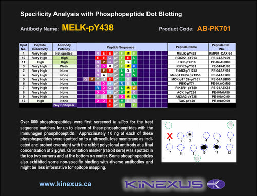 Antibody Immunogen Description: Corresponds to amino acid residues N435 to F441; In the C-terminal third of the protein kinase. This is the major in vivo phosphorylation site in MELK.