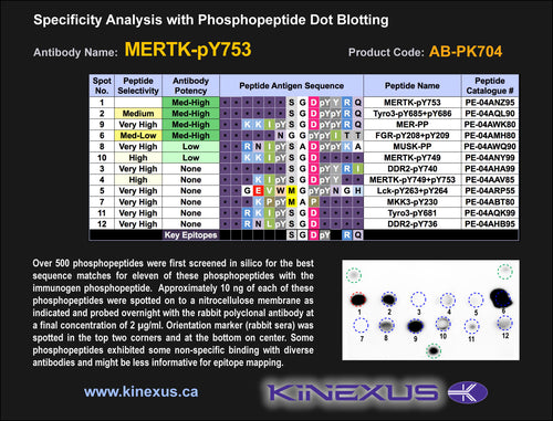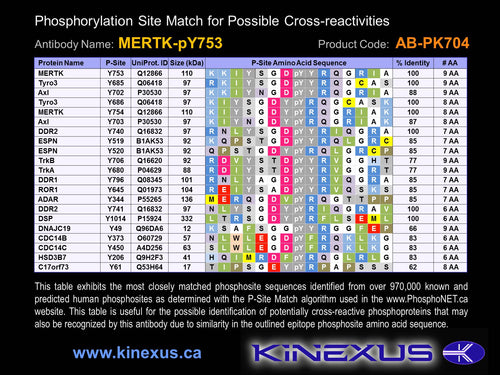 Scientific Background: MERTK (MER) is a protein-tyrosine kinase of the TK group and Axl family. It is a receptor kinase that functions in the regulation of cell survival, angiogenesis, migration and invasion, differentiation, and phagocytosis of apoptotic cells. Phosphorylation of Y749, Y753 and Y754 increases phosphotransferase activity.