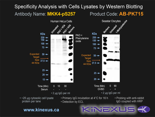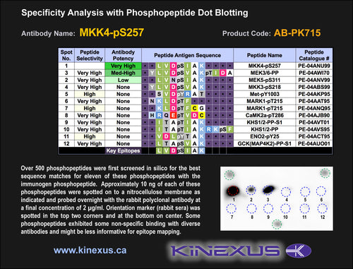Antibody Potency: Very strong immunoreactivity with immunogen peptide on dot blots. Very strong immunoreactivity with recombinant human MKK4 on protein dot blots.