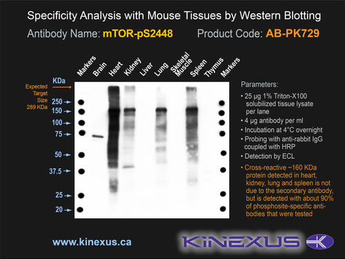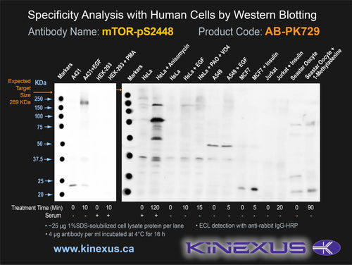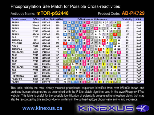 Scientific Background: mTOR (FRAP1) is a protein-serine/threonine kinase of the Atypical group and PIKK family. It mediates cell growth, metabolism, and survival. It regulates various cellular pathways such as insulin signalling, eIF4e and p70S6 kinase activation for protein synthesis, HIFa, VEGF, nutrient and hormone signals, ribosome biogenesis, regulation of cell cycle progression, angiogenesis, cell polarity and cytokeleton reorganization. Phosphorylation of S2448 and S2481 increases its phosphotransferase activity, and it is stimulated by RHEBm. Phosphorylation of T2446 inhibits phosphorylation of the S2448 activatory site. It is also negatively regulated by DEPDC6. Dysregulation in signalling that leads to constant activation of mTOR lead to uncontrolled proliferation and cell cycle progression and oncogensis. Increased invasiveness has also be shown do be associated with mTOR activity. While it features a wide range of mutations, this might reflect the very large size of the protein rather than its identification as a tumour suppressor protein. Cancer-related mutations for mTOR in human tumours point to a gain of function of the protein kinase, indicating that it might function as an oncoprotein (OP). The active form of the protein kinase normally acts to promote tumour cell proliferation. mTOR has been linked with Tuberous Sclerosis, Subependymal Giant Cell Astrocytoma (SEGA), Lymphangioleiomyomatosis (LAM), Tuberous Sclerosis Complex, Plasmablastic Lymphoma (PBL), Ewing's tumours, and Kidney Angiomyolipoma.