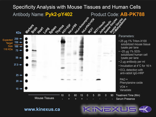 Scientific Background: PYK2 (PTK2B, FAK2) is a protein-tyrosine kinase of the TK group and Fak family. It is a non-receptor kinase that has a role in actin cytoskeleton rearrangement, cell migration, cell polarization, adhesion, bone remodeling, and controlling amount of marginal B-cells' migration and presence in the spleen. Phosphorylation at TY402 increases phosphotransferase activity and induces interaction with ErbB2, RasGAP and Src. Phosphorylation at Y579 increases its phosphotransferase activity. NPHP1 interaction with PYK2 has been interrupted with a P859A mutation. A phosphorylation site of PYK2 can be inhibited with an Y881F mutation, which will also impair GRB2 interaction.
