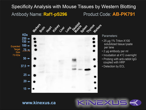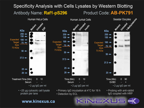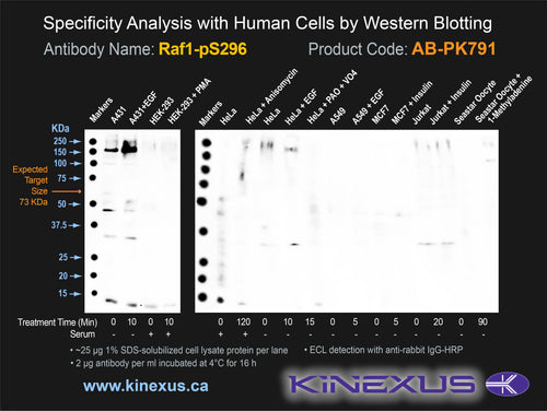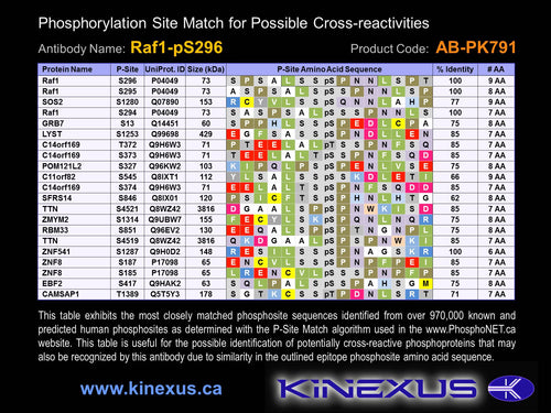 Antibody Immunogen Description: Corresponds to amino acid residues L293 to N299; In the region between the C1_1 and kinase catalytic domains. This is the major in vivo phosphorylation sites in Raf1.