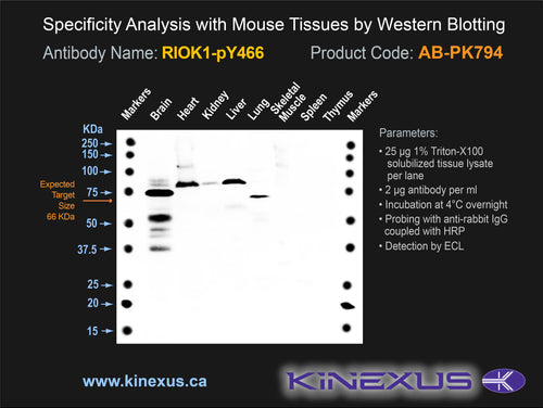 Antibody Immunogen Description: Corresponds to amino acid residues N463 to V469; In the C-terminal third of the kinase after the catalytic domain. This is a major in vivo phosphorylation site in RIOK1.