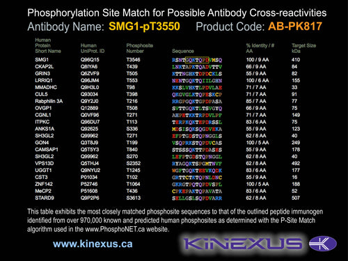 Antibody Immunogen Description: Corresponds to amino acid residues G3547 to D3553; In the C-terminus of SMG1. This is one of the two major in vivo sites for phosphorylation of SMG1.