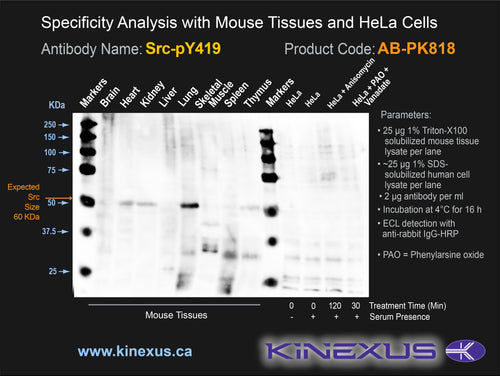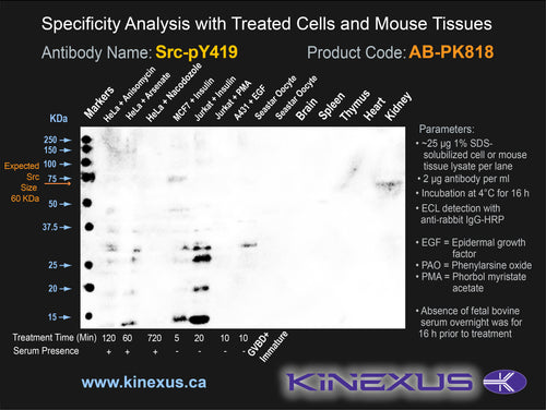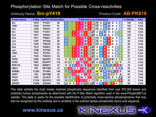 Scientific Background: Src is a protein-tyrosine kinase of the TK group and Src family. It is a non-receptor protein-tyrosine kinase that is widely distributed from low to moderate levels in most human tissues with highest expression in pancreas and stomach. Src was originally identified as a transforming protein of the Rous sarcoma virus (RSV) that had enzymatic ability to phosphorylate tyrosine in protein substrates. Src is activated by phosphorylation at S12, S75, Y419 and T420. S12 phosphorylation promotes interaction with PPP2R2C and Y410 phosphorylation induces interaction with Cbl-c. Phosphorylation at S17 may reduce phosphorylation at S12. Phosphorylation of S97 and Y530 inhibits Src phosphotransferase activity. Src is overexpressed and activated in a large number of human malignancies and has been linked to the development of cancer and progression to distant metastases. In addition to increasing cell proliferation, a key role of Src in cancer seems to be the ability to promote invasion and motility, functions that might contribute to tumour progression. Src has also been linked with the development of colon cancer. Insertional mutagenesis studies in mice also support a role for this protein kinase in mouse cancer oncogenesis. Although mutations that increase the catalytic activity of Src are well known, such as loss of the inhibitory tyrosine phosphorylation site at the C-terminus of the kinase, it is not subject to higher rates of mutations in human tumours than most proteins.