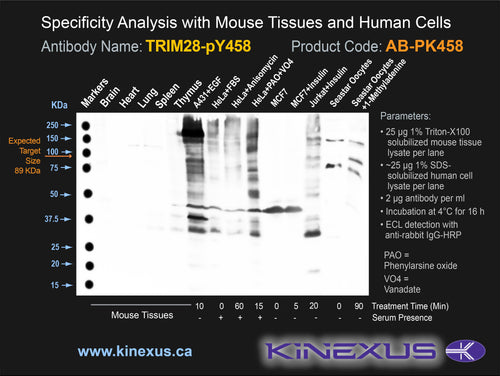 Antibody Immunogen Description: Corresponds to amino acid residues D455 to A461; In the region between the zf-B_box and PHD domains. One of the major in vivo sites of phosphorylation in TRIM28.