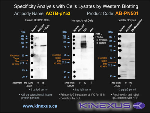Antibody Cross Reactivity: Prominent immunoreactivities in FBS-treated Jurkat cells at 75,to 120 kDa range were detected. No other cross-reactive proteins were observed in Jurkat, HEK-293 and seastar oocytes.
