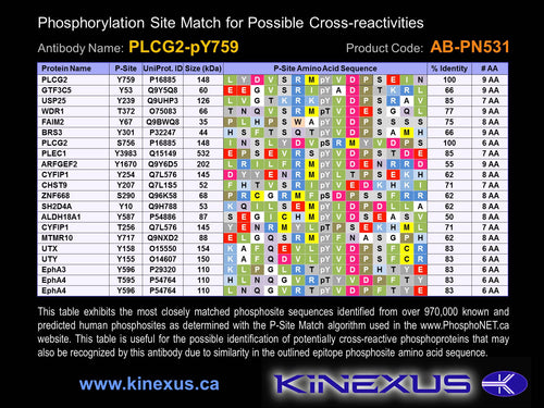 Antibody Immunogen Description: Corresponds to amino acid residues S756 to P762; Near the end of the second SH2 domain in the protein. One of the major in vivo phosphorylation sites in PLCG2.
