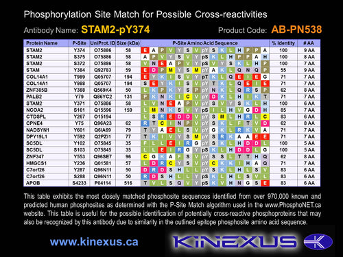 Antibody Immunogen Description: Corresponds to amino acid residues Y371 to L377; In the C-terminal half of the protein. This is the second major in vivo phosphorylation site in STAM2.