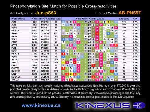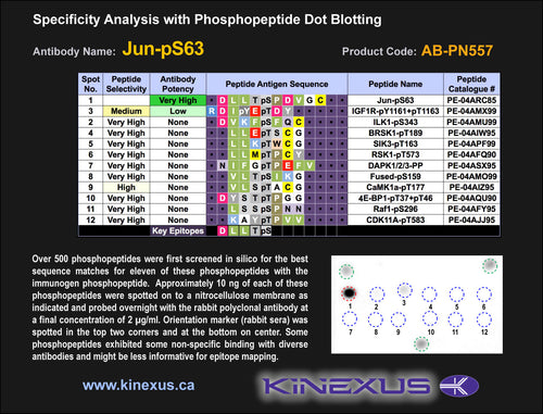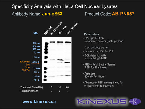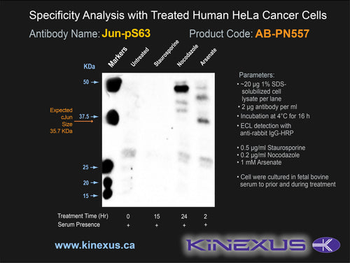 Antibody Immunogen Description: Corresponds to amino acid residues D59 to G67; In the N-terminus of the transcription factor. These are the major in vivo sites of phosphorylation of c-Jun.